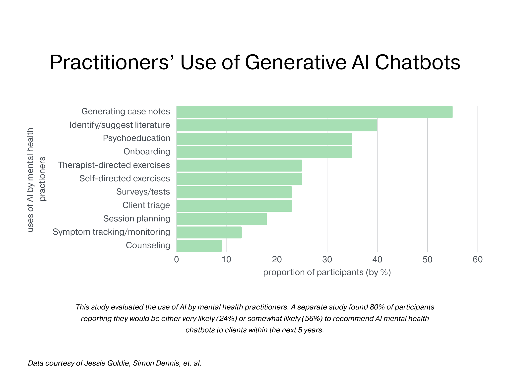 This may be the case already. A recent small survey of 23 practitioners found that many professionals are already using AI in their psychotherapy. Moreover, another study published in March of 2024 showed that almost half used ChatGPT to answer clinical questions or do more administrative work.