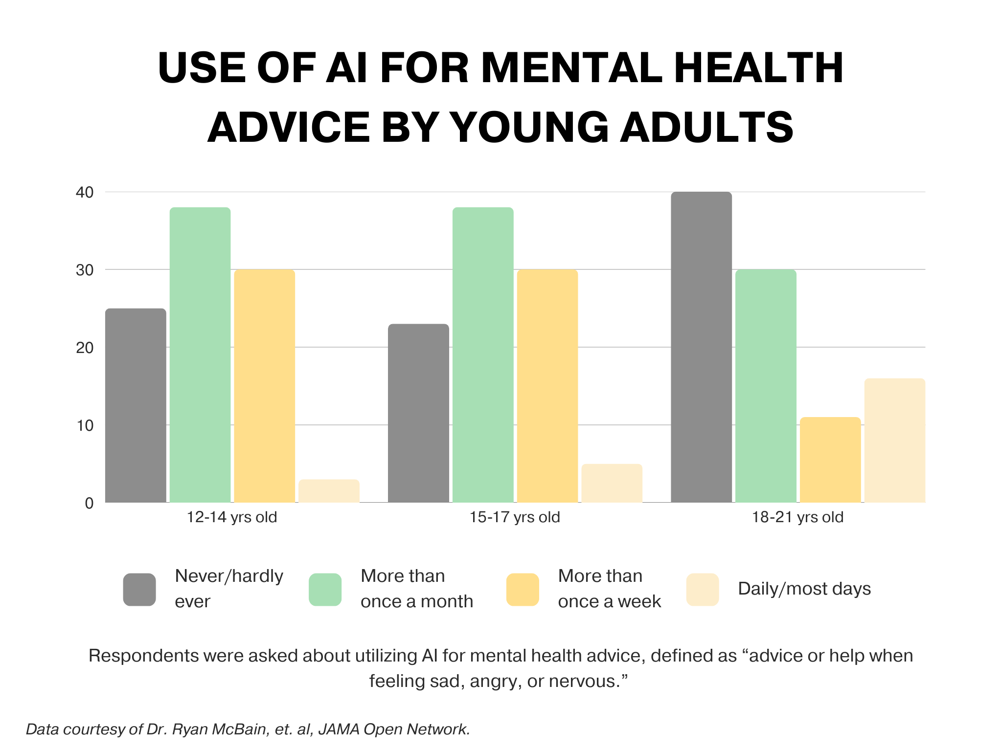 A study published in JAMA Network Open found that one in eight adolescents, particularly those between 18 and 21 years old, use generative AI for emotional advice already. Given the already dominant role AI is playing in the emotional lives of young adults, researchers like Jacobson, Pavlick, and Bunge emphasize regulation and development of specific technologies, not letting ChatGPT blindly simulate therapy.